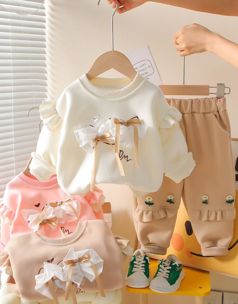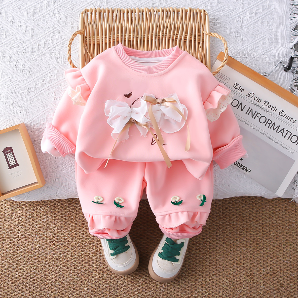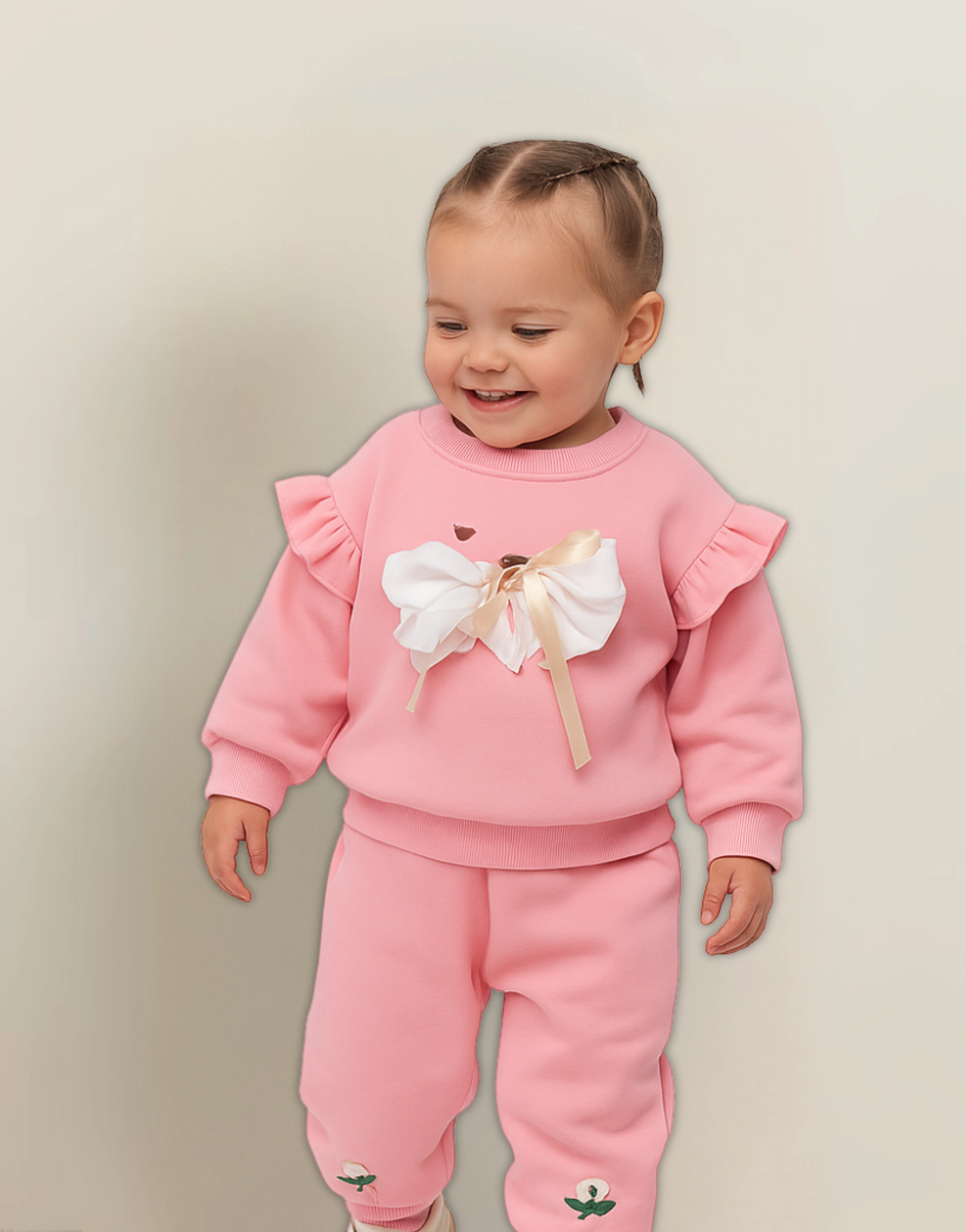 Fuel your little fashionista’s charm with this adorable pink co-ord set! The soft sweatshirt is beautifully detailed with frilly sleeves, delicate lace accents, and a 3D bow applique, while the comfy joggers feature floral embroidery and ruffle trims. Perfect for playful days, cozy outings, or capturing those picture-perfect moments in style.