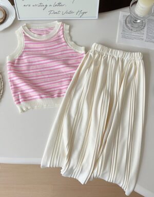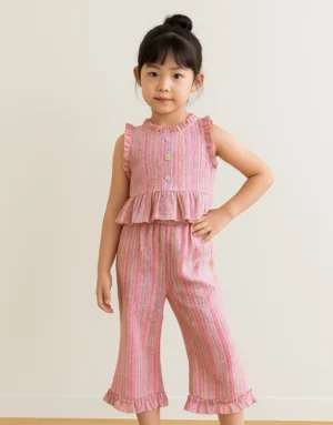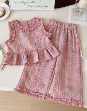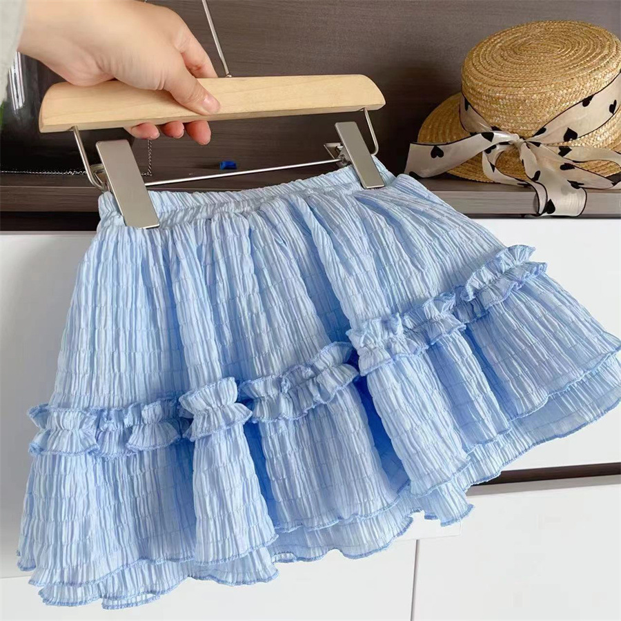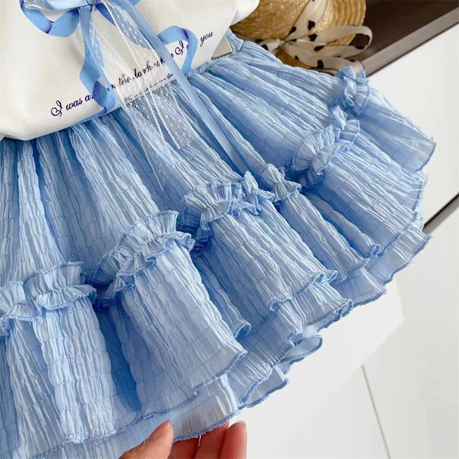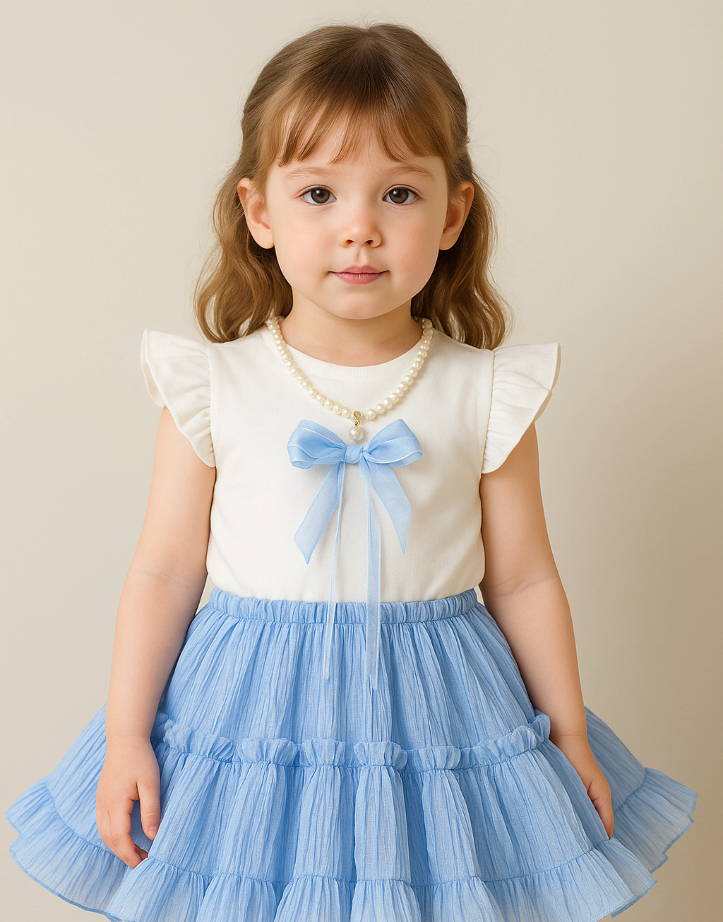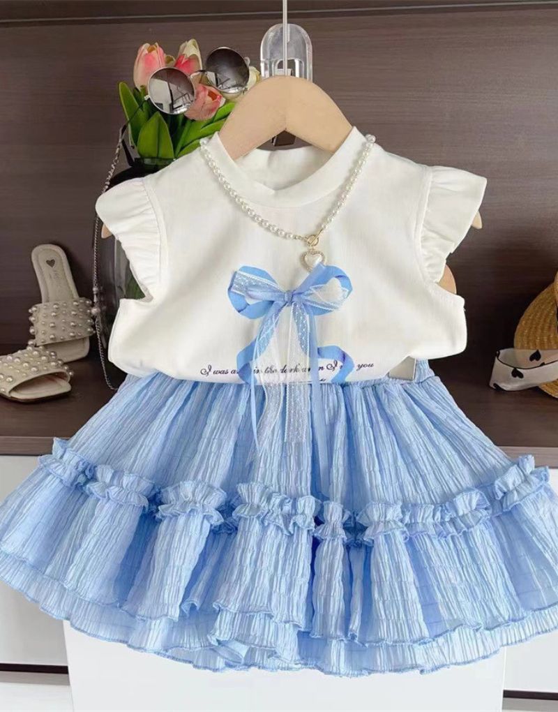 This dreamy two-piece set features a soft white flutter-sleeve top with a pearl necklace detail and satin bow accent. Paired with a tiered, crinkle-textured light blue skirt, it offers a graceful, princess-inspired look perfect for birthdays, celebrations, or stylish summer days.