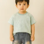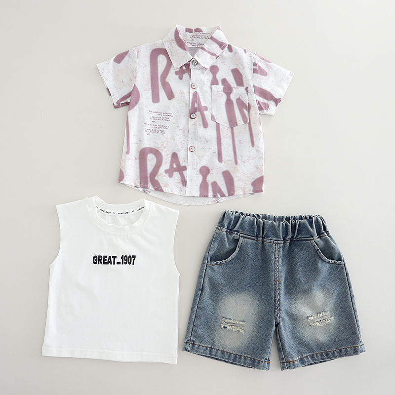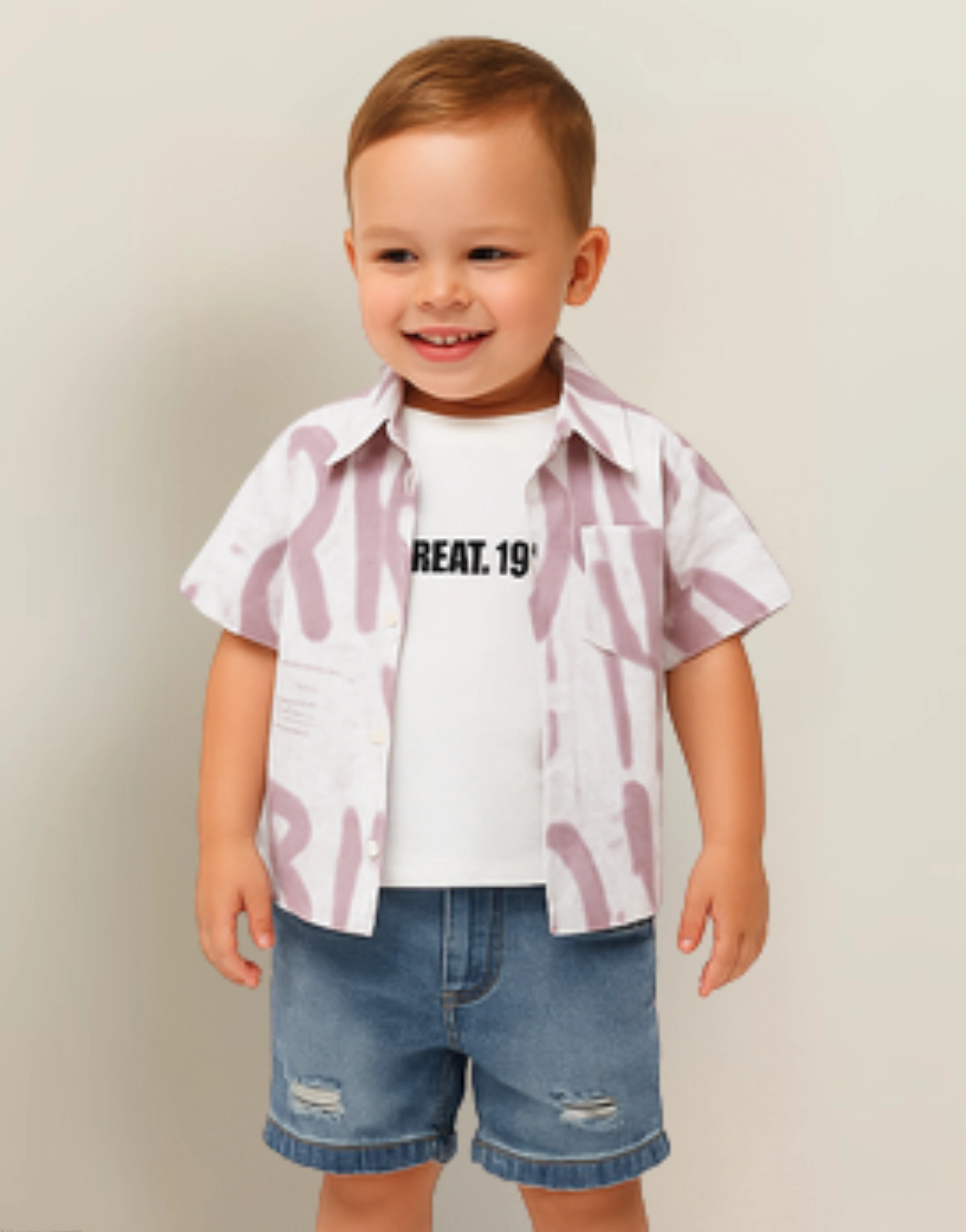 Add a splash of style with this white shirt featuring bold plum graffiti prints, layered over a graphic “GREAT_1907” tee. Paired with distressed blue denim shorts, this outfit brings a perfect mix of comfort and cool to your child’s wardrobe