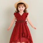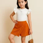 Add charm to your child’s day with this trendy off-shoulder crop top featuring bold black leaf prints on a cream base. Paired with matching wide-leg palazzo pants, it’s a breezy and fashionable pick for stylish strolls, summer parties, or vacation vibes.